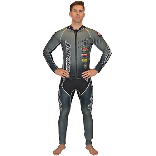 The Jettribe wetsuit john and jacket Race Suit is built, designed, and engineered for the riders’ maximum comfort, flexibility, warmth and mobility. Our Jettribe RaceSuits are built with strategic placement of 2-3 mm neoprene panels. The 3mm panels are for the warmth and 2mm panels are built into the high movement areas: the inner arms and legs. We spent a year field testing with our Jettribe Race Team under racing conditions. The results are features like the Jet Grip texture print placed on the inner thigh panels and legs to provide the rider with additional traction while riding. All seams have our interlocking flat stitch to provide a watertight seal and maximum comfort against the skin. We carefully select just the right combination of thicknesses of neoprene to retain a rider’s body heat white riding in various conditions. The wetsuit neoprene’s property is a closed, high density foam made up of thousands of tiny air bubbles known as cells. These cells provide an insulation barrier which slows down the conduction of heat, allowing the body’s heat to be retained. Jettribe John/Jacket Race Suits are engineered with the understanding of the PWC rider’s constant movement which often over-generates body heat. For example, surf wet suits are designed for a body constantly being in the water. The bold and oversized graphics are printed by a gas fusing process, so the material is soft and light to the touch without fading or cracking like screenprinted logos. While our Jettribe Wetsuit John/Jacket Race Suits are designed for the true PWC rider who is both in the water and in the cold air! We at Jettribe are proud to present the Race Suit! Enjoy Every Ride – Jettribe Family!