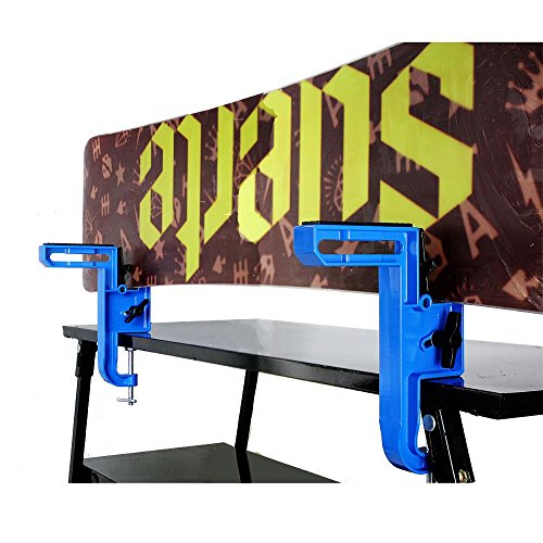 Ultra wide space 280mm(11.02 in)place any size snowboard and 2pcs alpine ski. Good Value. 2-piece set. 2 end supports with clamp device.Waxing and Tuning your Snowboard and Alpine ski. High qualityAluminium ,steel and rubber construction material to keep durable,stable and long time life. Multiple angle option(Horizontal and vertical) settings for side edge tuning allow for increased comfort and visibility while tuning your snowbaord and apline ski base and edge and waxing. Vise clamp to workbenches or table up to 2.36 in(60mm) thickness. Material:Aluminum and Steel ,and rubber. We extra offered 2pcs brake retainers to you. Packing a 230mm length snowboard waxing scraper,this a nice snowboard waxing kit.Save money. Weight:1.42kgs